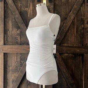 NWT, This one piece features a demi-scoop neckline, shirred side seams, removable cups, adjustable lingerie straps, and moderate rear coverage.