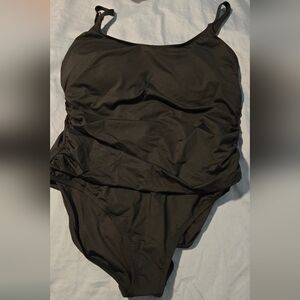 •Thin over the shoulder, adjustable straps. Sleek scoop neckline. Straight back. Removable cups. Lined. Side and midsection shirring detail. High-cut sides and full coverage bottom for a secure fit.