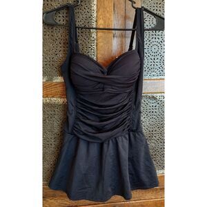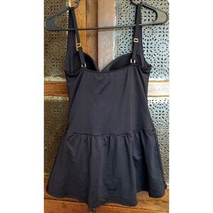 NWT La Blanca Island Goddess Skirted One Piece Swimsuit, Size 6, Black/Gold. This Swimsuit features an over the shoulder style with ruched top, built in padded cups, skirted bottom and adjustable straps with gold colored hardware. Self: Made from 85% Nylon and 15% Elastane. Hand Wash Only! See photos for more detail and material and care information.