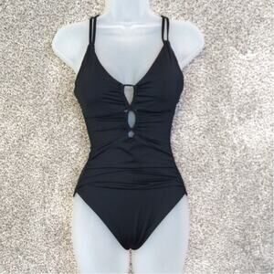 Flattering and functional, this La Blanca Island Goddess one-piece swimsuit (size 4) features a supportive underwire bust, lace-up neckline, and slimming ruched sides. Adjustable straps and a classic black color make this a standout for resort wear or everyday swim.
