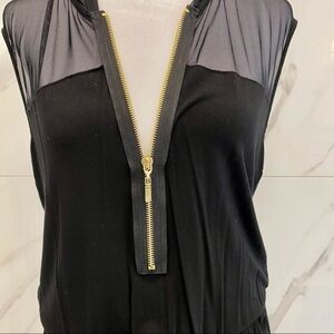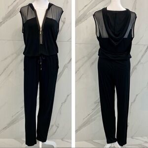 La Blanca Jumpsuit in black with mesh detail, gold-tone zip up front closure, mesh hood, side pockets, and cinch-tie waist. Size XS. Worn once and in excellent condition. *See photos for approximate measurements laying flat.