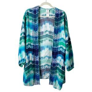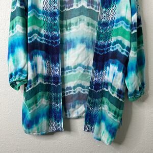 Global tie dye. Kimono cover up. Open front. Long sleeves. Embroidered. 100% Rayon/Viscose