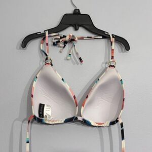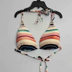 Stylish string bikini top with multicolor stripes. Halter neck design with open back. Perfect for the beach or pool.
