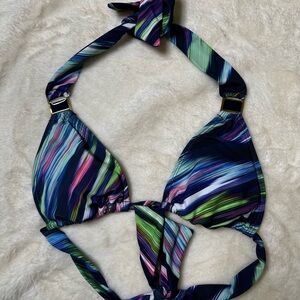 Vibrant bikini top with multicolor stripes. Features adjustable straps and gold accents. Perfect for a stylish beach day.