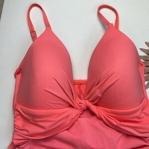 This sleek and contemporary one-piece swimsuit by La Blanca features a vibrant pink hue, a plunging V-neckline with a twisted knot detail, and adjustable spaghetti straps. The design includes molded cups with light padding for added comfort and support.