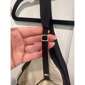 Removable pads. Adjustable straps. Black and cream with gold hardware.