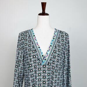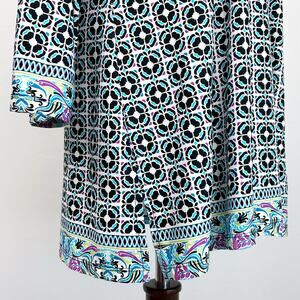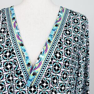 Size Medium La Blanca swimsuit cover-up/mini dress. Smooth fabric with a colorful blue and black tile print. Contrasting trim on the neckline, cuffs and hem. No flaws, great condition!