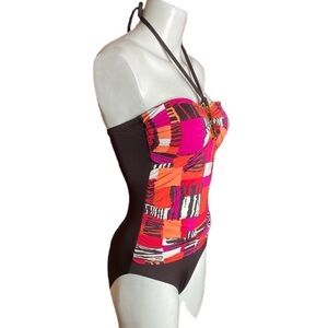 It has a sexy abstract geometric print in red, orange and pink on the front torso, and it's ruched down either side for a sexy, flattering fit.