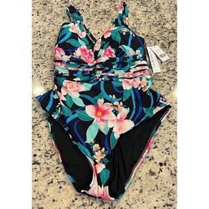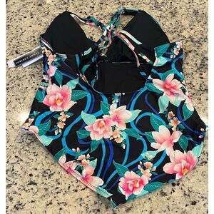 DESIGNER SUMMER SWIMWEAR — Destination paradise. The beautiful blooms set against a black background on this one-piece suit bring to mind a moonlit stroll along a sandy beach.