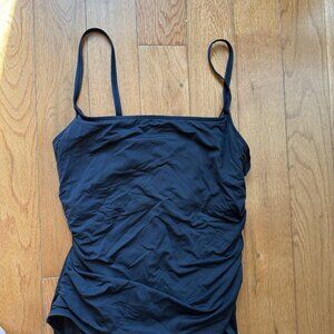 Ample shirring through the waist flatters your figure in this minimalist one-piece designed with a sleek scoop neck and high-cut sides.