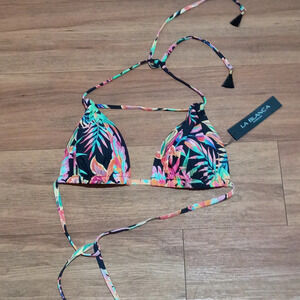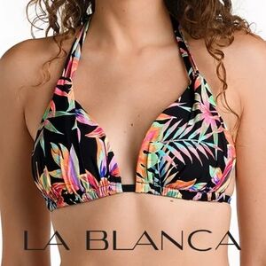Embrace vibrant style with the La Blanca Women's Tropical Print Bikini Top. Featuring a colorful tropical design on a black base, this bikini top is perfect for a chic beach look.