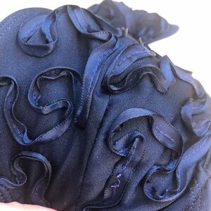 La Blanca soutache bikini top soft with underwire support, adorable mini ruffles on the surface. The underwire is one piece and not bendable. Size 12 bra, fits a B and C cup, plastic hook closure, straps are not adjustable.
