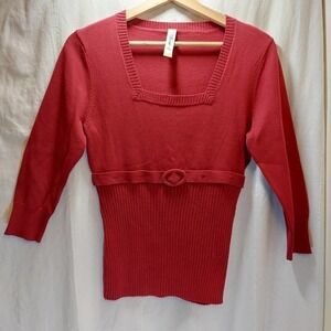 LA Blues Red Belted 3/4 Length Sleeve Women's Sweater, Small. Great preowned sweater, like new, no visible rips or stains. Size small measures 19 inches from pit to pit and 23 inches from shoulder to hem. Machine washable 100% cotton. 3/4 length sleeves. Lightweight so can be worn Spring, Winter, and Fall. Items ordered before 12 noon Central time ship that day, M-F. Smoke and pet-free environment.
