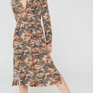 Washed silk button front dress in camouflage print with contrast piping.