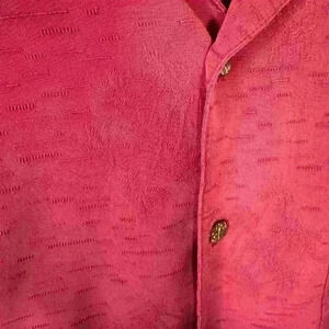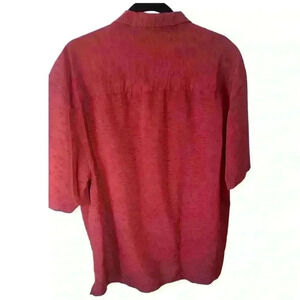 Description: Add a touch of island style to your wardrobe with this La Cabana button-up shirt in a bold red hue, size XL. Crafted from a soft and breathable rayon-polyester blend, this shirt features a classic Hawaiian-inspired look with a comfortable, relaxed fit. Perfect for vacations, casual outings, or warm-weather events, it has a front chest pocket and a subtle textured pattern for added style. Pair it with shorts or jeans for an effortlessly laid-back look.