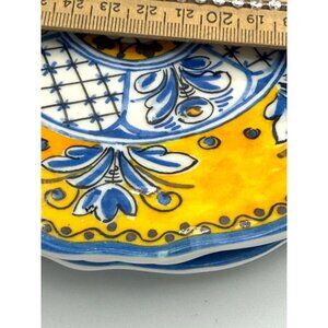 Le Cadeaux dinnerware is heavy weight melamine that is extremely durable, yet beautiful. Pieces are often mistaken for Italian ceramics. Resistant to chipping and breaking, Le Cadeaux is perfect for entertaining indoors or out, worry-free. Do not microwave. PreOwned but in wonderful condition. Appear to be a small tiny little rough areas on a few of the plates. See photo #4 not really a big deal...at least for me.