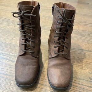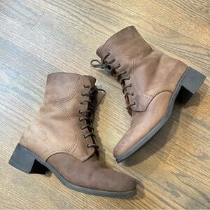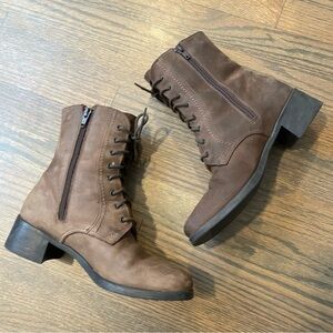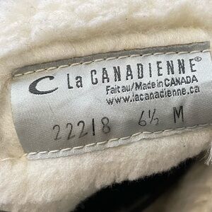 La Canadienne Brown Suede Square Toe Block Heel Side Zip Ankle Boot Fur Lined