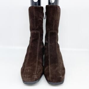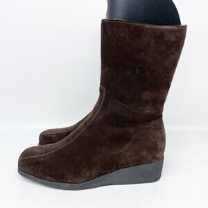 Stylish yet functional, these mid-calf suede boots feature a wedge sole for added comfort and durability, ideal for colder seasons or casual outings. • Zipper closure for easy wear • Durable rubber wedge sole • Soft, plush lining for warmth • Elegant suede material • Classic brown color Condition: Pre-Owned Good Sharpie on bottom and insoles. Scratches on toe and heel areas of both shoes. Scuffs on inner heel areas of both shoes. Minor wear on bottom soles. All as seen in photos. Size: 5.5M