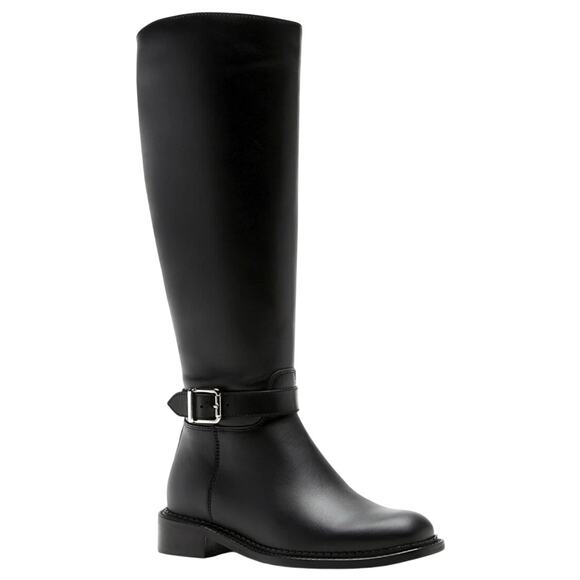 Introducing the La Canadienne Stevie Leather Boot, a timeless and stylish addition to your wardrobe. Sleek black knee-high boots designed for durability and style. Featuring a chic silver tone buckle accent and side zipper for easy wear.