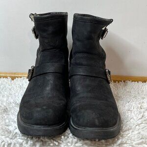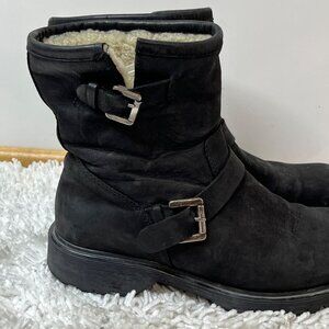 La Canadienne Suede Shearling Lined Buckle Moto Boot Black Ankle Pull On 7.5