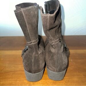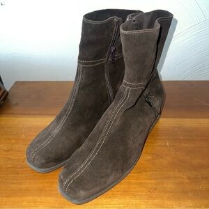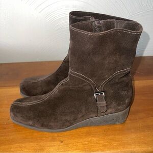 Elevate your winter style with these chic La Canadienne Laverne boots in a beautiful brown color. The ankle-length boots feature a square toe shape and a low wedge heel, perfect for adding comfort and style to any outfit. The boots are made with high-quality suede and lined with microfiber, ensuring durability and warmth during the colder months.
