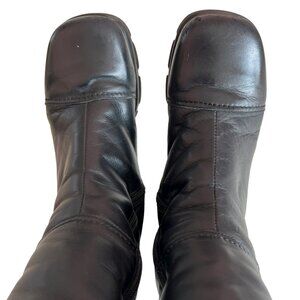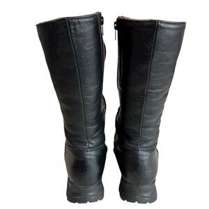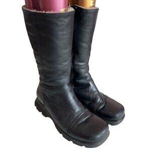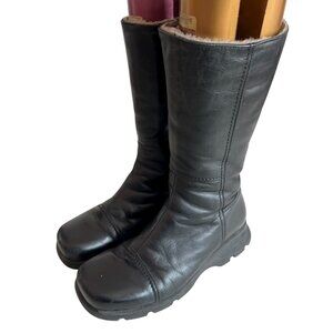 La Canadienne boots, black leather, patchwork/seamed, squared toe, chunky soles, shearling lined, side zipper, 11" tall shaft, 14" opening, US women's size 8, preowned and shows wear on the soles, scuffing and scratches on the exterior, creasing - see photos