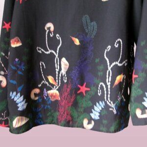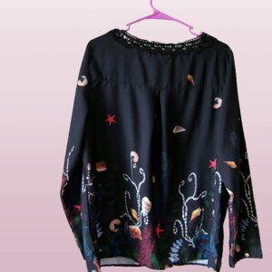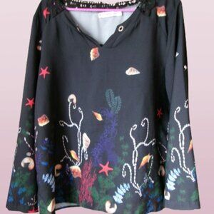 La Cattleya coastal beachy sheer blouse seashells starfish ocean sea in black/multi-colored size large.