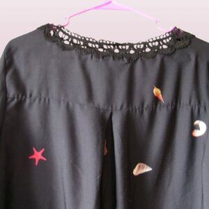 La Cattleya coastal beachy sheer blouse seashells starfish ocean sea in black L