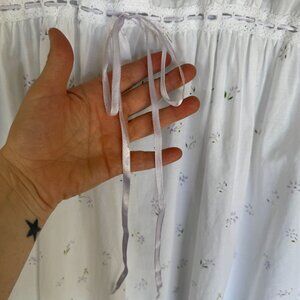This Night Gown / Midi Dress from La Cera is Made in India and constructed in 100% Cotton poplin white with lavender and green primrose print fabric. It features a round scoop neckline, white crochet lace collar and armholes, pin tuck front bodice, lace inset empire waist with lightest lavender satin drawstring adjustable tie, side seam pockets and a full gathered midi length silhouette. This is cottagecore, romantic, girly, vintage inspired, euro summer, house dress, nighty, summer dress, coastal, garden party, french girl vibes.