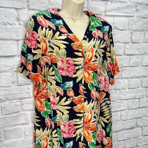 La Chine Plus Silk Shirt Dress Blue Tropical Floral Size 12W Short Sleeve Button