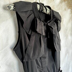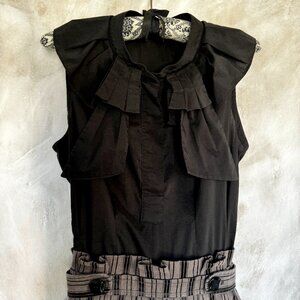Brazilian brand La Chocole sophisticated sleeveless dress. One piece which looks like a top and skirt. The blouse top is black with multiple ruffled layers, buttons up high on the neck. Soft and lightweight.