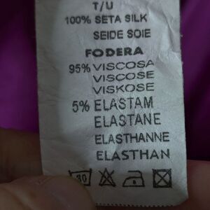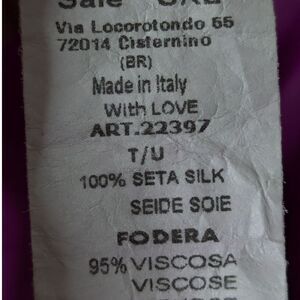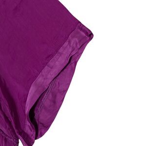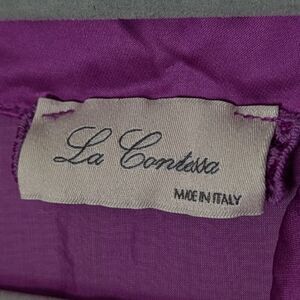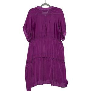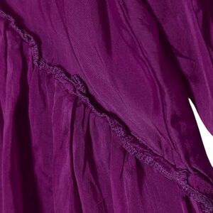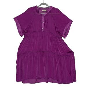 The La Contessa Oversized 100% Silk Sheer Short Sleeve Tiered Babydoll Mini Dress is a luxurious addition to any woman's wardrobe. Made in Italy, this knee-length dress features a solid purple color with a collared neckline and button closure. The tiered babydoll style and oversized fit make it perfect for a casual occasion in the summer, fall, or spring. With its trapeze & swing style, tiered accents, and bohemian theme, this dress is sure to make a statement and turn heads wherever you go.