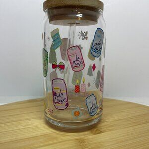 La Croix Holiday Christmas Water Drink Glass Wood Lid Glass Straw Promo