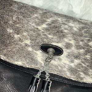 Smaller compartment underneath the cowhide flap has a zipper closure