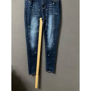 Trendy La Denim Studio skinny jeans in a size 3. Features pearl embellishments across the front, a flattering skinny fit, and a dark wash design. Stretch fabric for comfort and style. Perfect for casual or dressed-up looks.