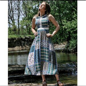 Beautiful patchwork midi dress! A little open crochet trim down the bust. Fit and flare silhouette. Chunky chain accent woven into fabric to accent neckline. Back exposed zipper. Patchwork pattern. Sleeveless. Round neck.