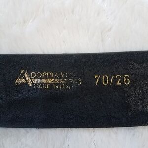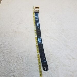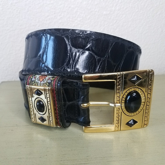 In excellent condition, croc embossed, leather, gold beaded hardware, tapestry detail, size 70/26, fits small maybe medium-please see measurements.