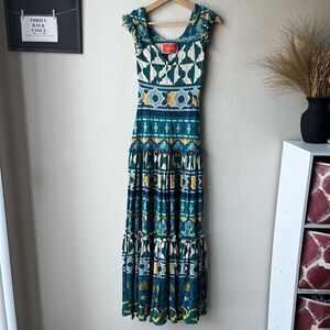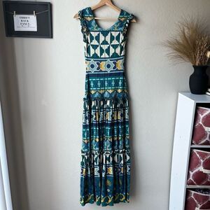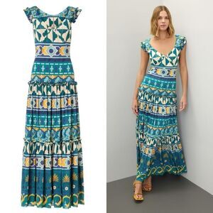 La DoubleJ Dress Pimento Blue Printed V-Neck Short Sleeve Maxi Dress Size XS
