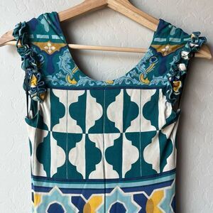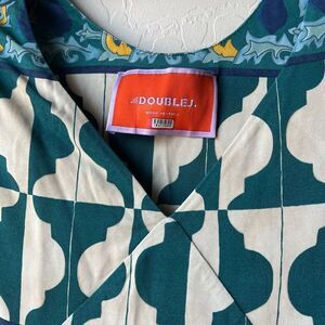 Crafted from stretchy jersey to flatter curves, this LA DoubleJ dress boasts a dropped waist for a modern, elegant allure, while ruched tiers gives it a festive flare. Maximalists will rock this all over printed version. A day to night dream, this piece goes from a morning on the Amalfi to a summer wedding in a cinch. And she has pockets. Blue geometric graphic print V-neck. Sleeveless. Side Zipper Closure. Made in Italy. Size XS.