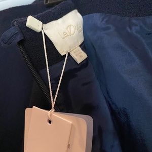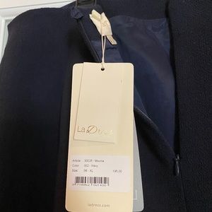 La Dress Couture Suit. US size 12-14; netharlands L/XL size. Ladies, this suit is exquisite.Navy blue. For the board room or that one interview where you need to dress to impress. I’m recently retired, and therefore purging this beauty! Blazer and skirt sold together, blazer is fitted with flare. Skirt is pencil to the knee. If you need ‘that’ outfit for ‘the interview’ this is it! P.S. this brand is from Holland, it’s exquisite!