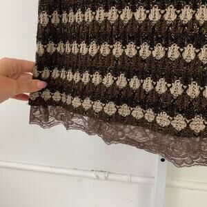 Ballet neck, 3/4 sleeves, pullover style, finishes above the knee with a lace-trimmed hem. Brown 'stripes' with subtle metallic threads throughout. Lined.