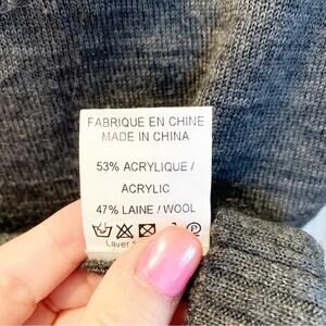 Charcoal gray wool blend knitted owl applique sweater. Banded neck, bottom and cuffs. 53% acrylic/47% wool. Marked size 1 = Size X Small. NWOT.