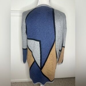 Excellent condition geometric cardigan in a chic blue, gray, and tan blend. It has two pockets on the side. Perfect for a fall or winter outfit.