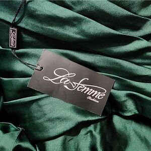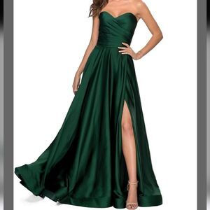 This strapless gown is styled to bring out its luminous shine and dramatic movement with its gathered crossover bodice, swirling full skirt and puddle train. The skirt swishes as you move, revealing bold flashes of leg.