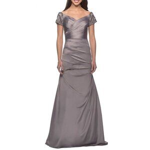 Elegant floor length satin gown with all over ruching and off the shoulder sleeves.