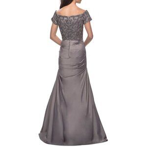 La Femme 25996 Embellished Pleated Trumpet Off Shoulder Satin Gown in Si…
