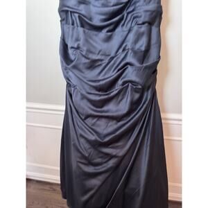 Elegant floor length satin gown with all over ruching and off the shoulder sleeves. A soft V shaped neckline and beaded pattern on the sleeves complete the look. Back zipper closure.