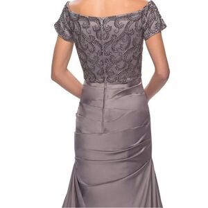 La Femme Dresses La Femme Off The Shoulder Beaded Satin Trumpet Gown