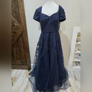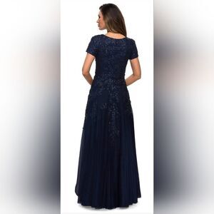 La Femme 28037 Short Sleeve Beaded Appliqued Lace Dress NWT size 12 Navy Blue