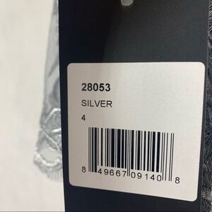 La Femme Silver Embroidered floor length gown in size 4. 28053. New with tags, no flaws. An elegant gown is detailed with floral embroidery from the sweetheart neckline through the floor length skirt with the sleeves. A line dress, three quarter sleeves, lined, back zip closure, 100% poly. Spot clean. Measurements are approximates only. Length 62” bust 17” waist 14.5 hip 18” flat lay measurements